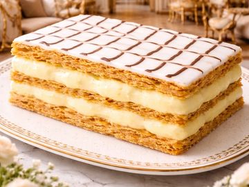 Pastry made of three layers of puff pastry alternating with two layers of vanilla pastry cream. SF. NF