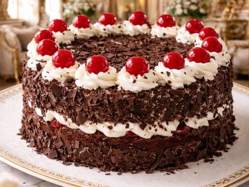 Layers of chocolate sponge cake (génoise) soaked in Kirsch cherry brandy, filled with chantilly and tart cherries. SF